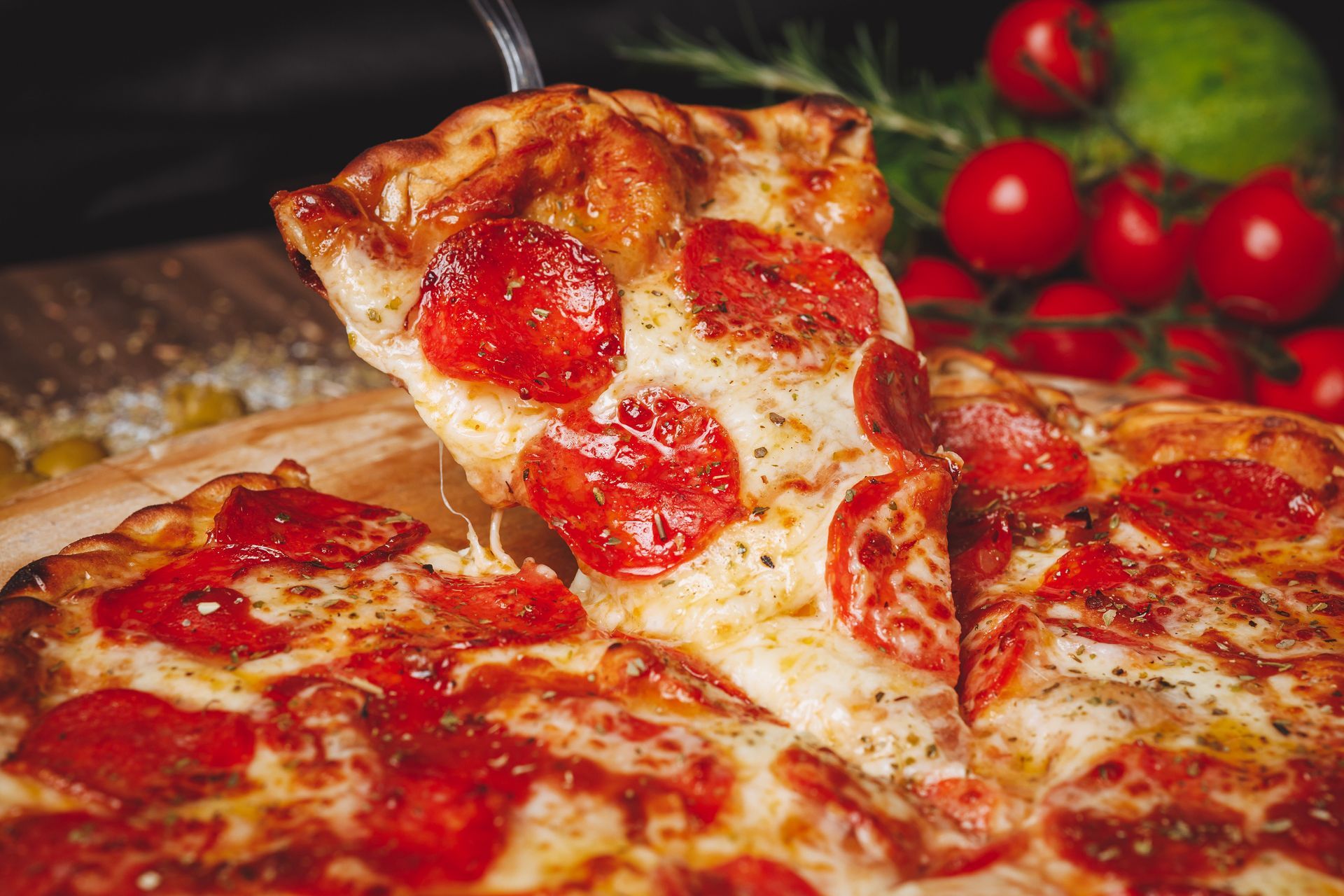 Molho de tomate, mussarela, orégano, azeitona, pepperoni.