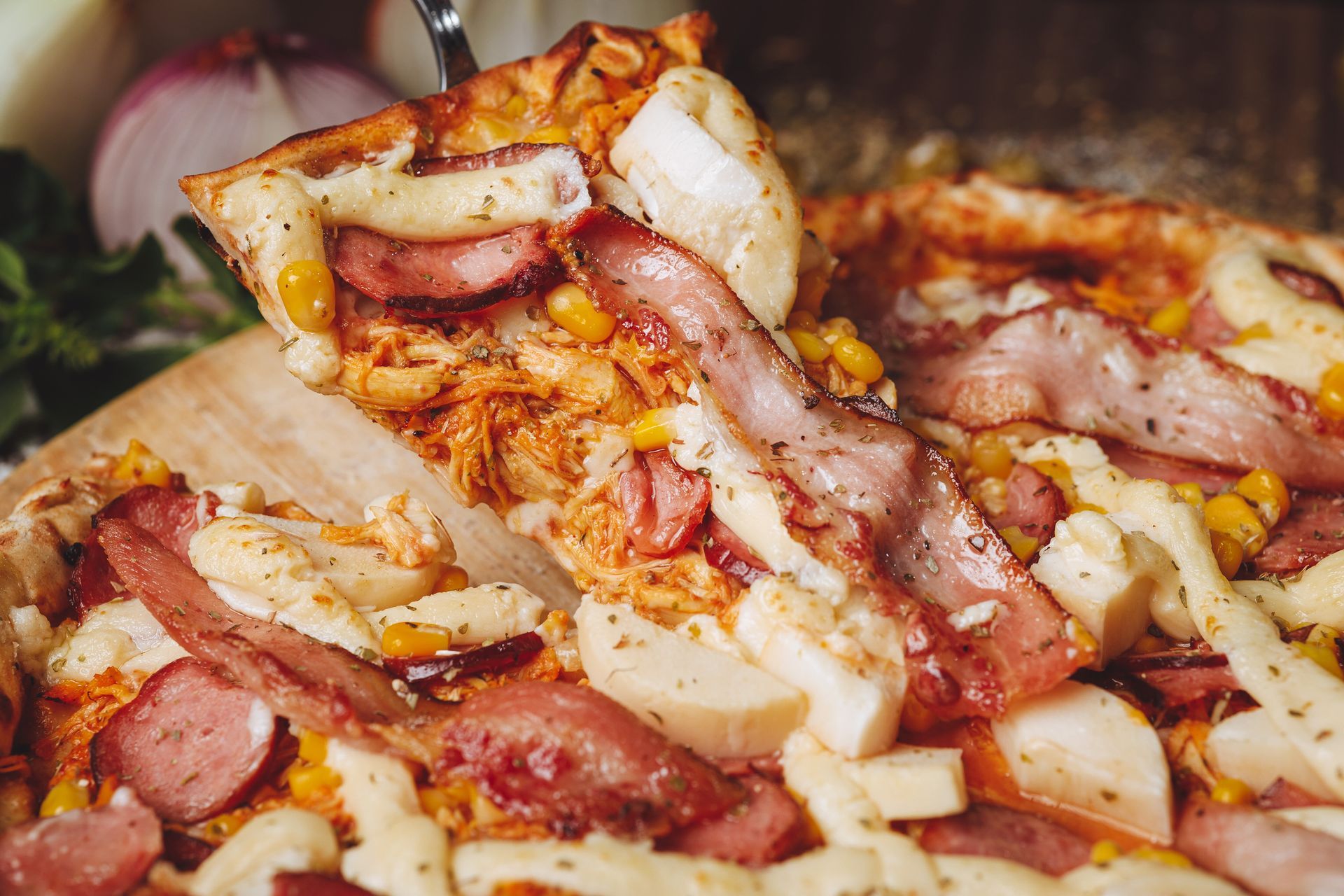 Molho de tomate, mussarela, orégano, azeitona, presunto, bacon, calabresa, frango, ovo e milho.