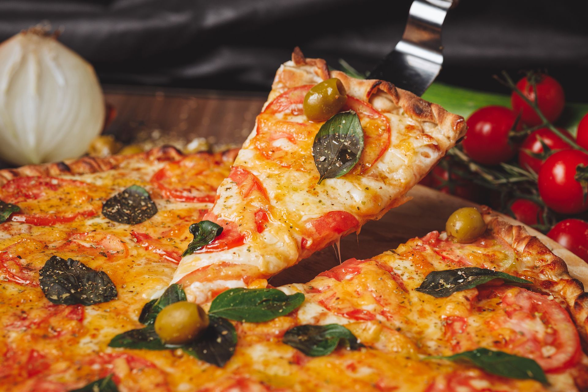 Molho de tomate, mussarela, orégano, azeitona, parmesão, manjericão e rodelas de tomate.