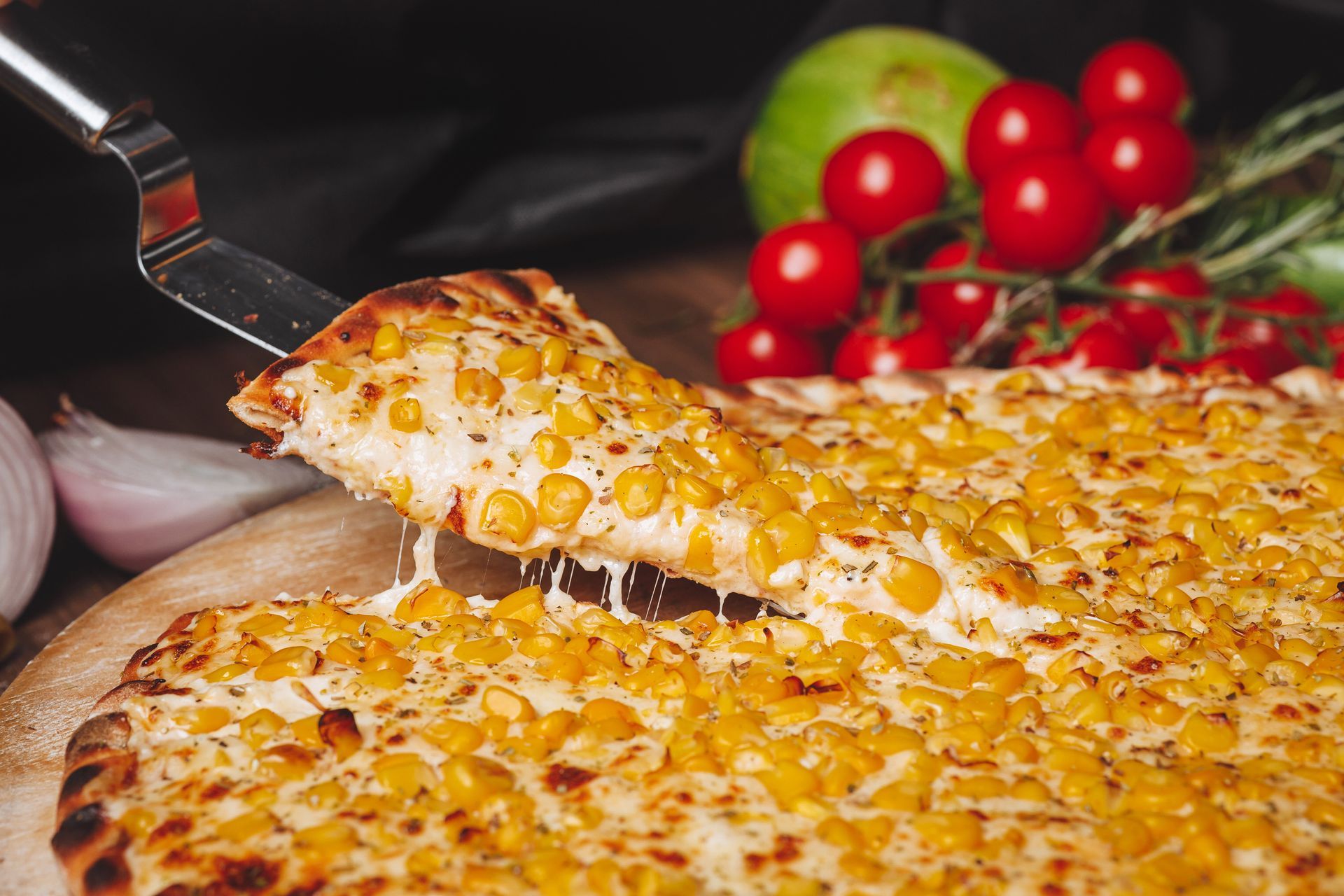 Molho de tomate, mussarela, orégano, azeitona e milho.
