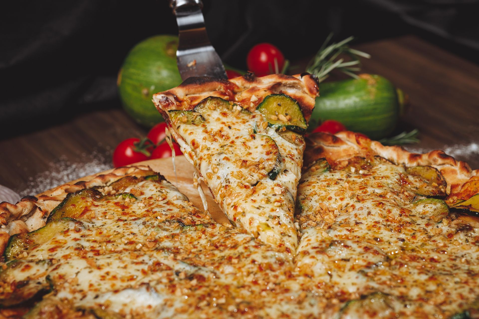 Molho de tomate, mussarela, orégano, azeitona, abobrinha fatiada e alho frio.
